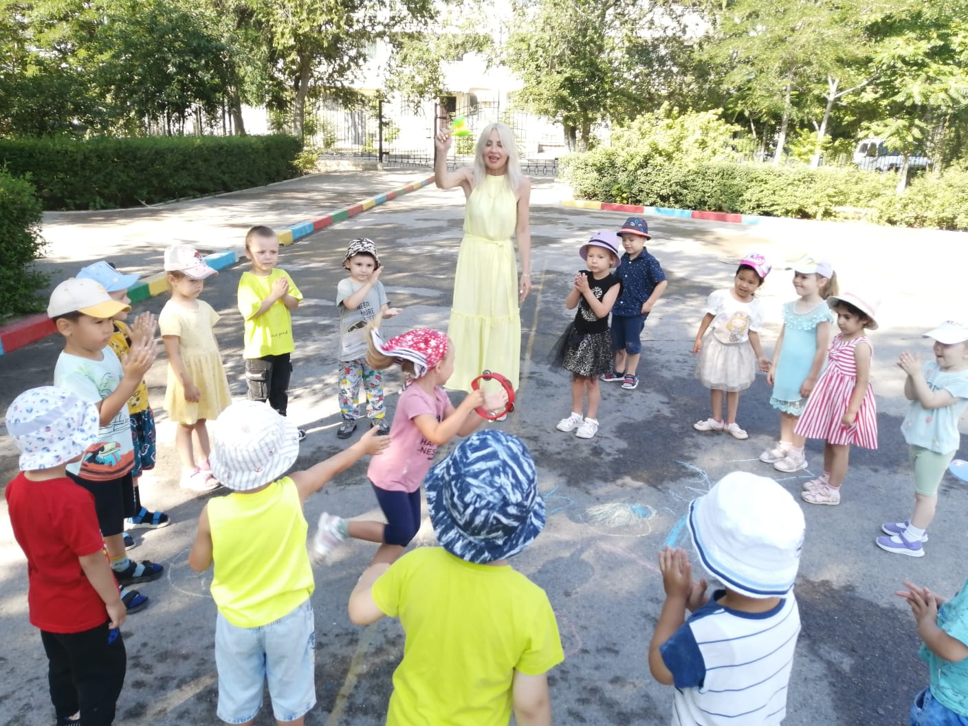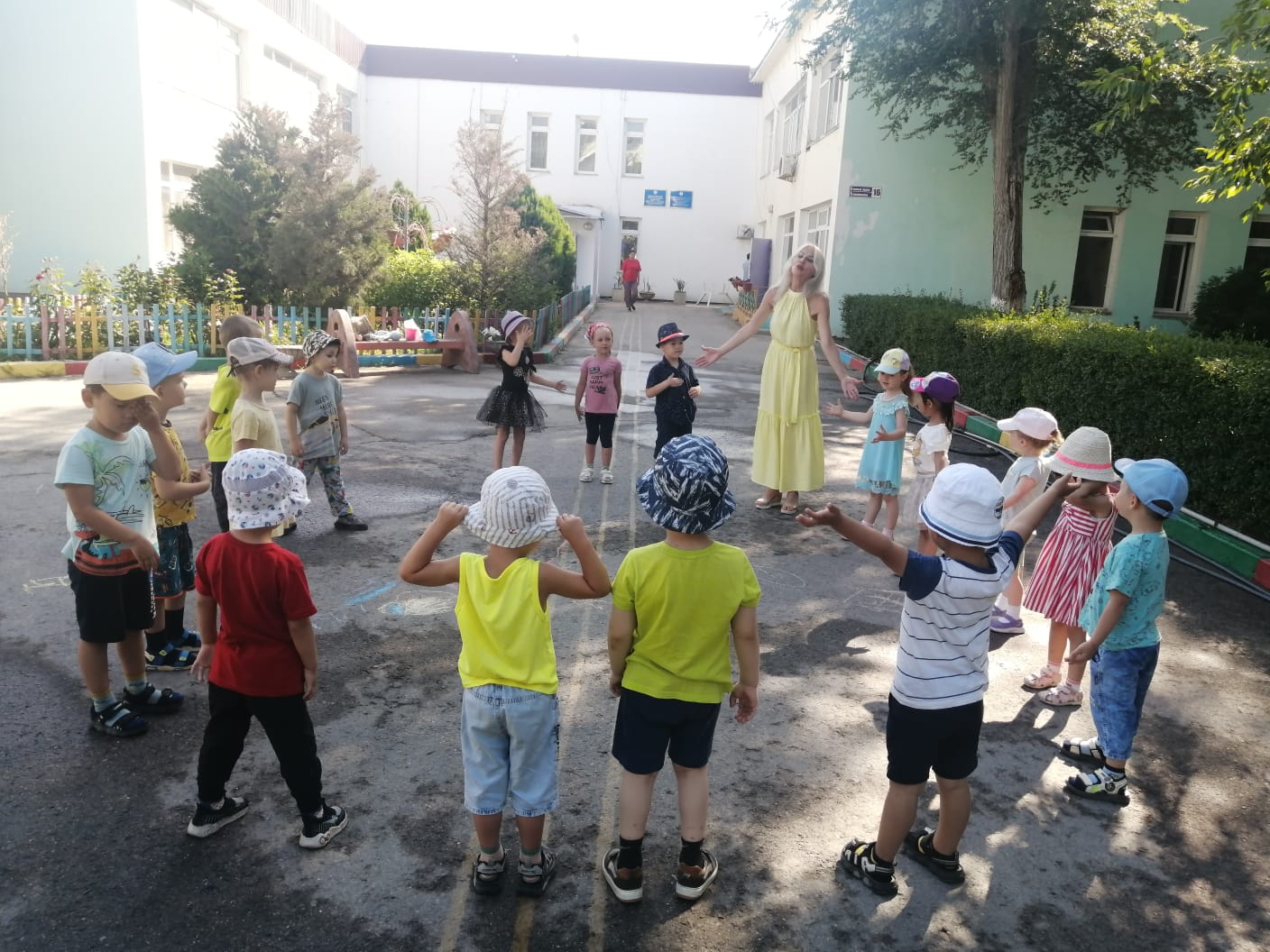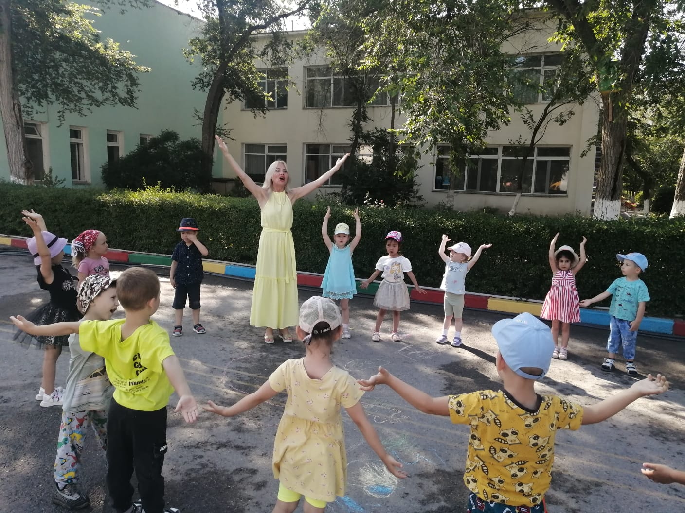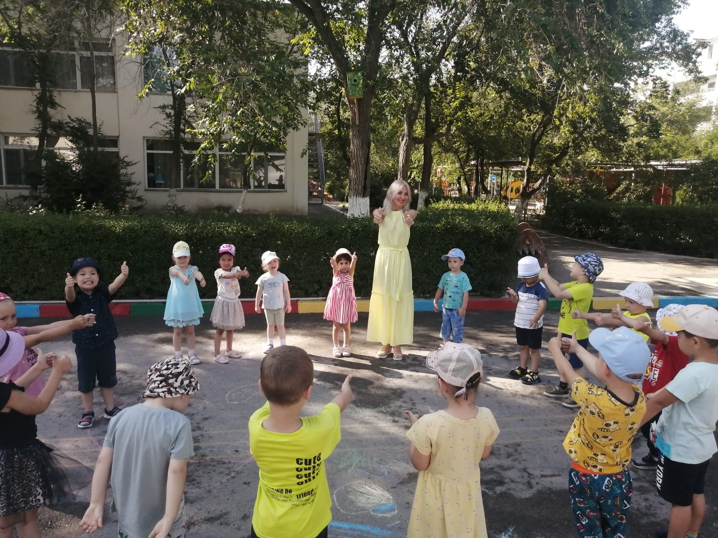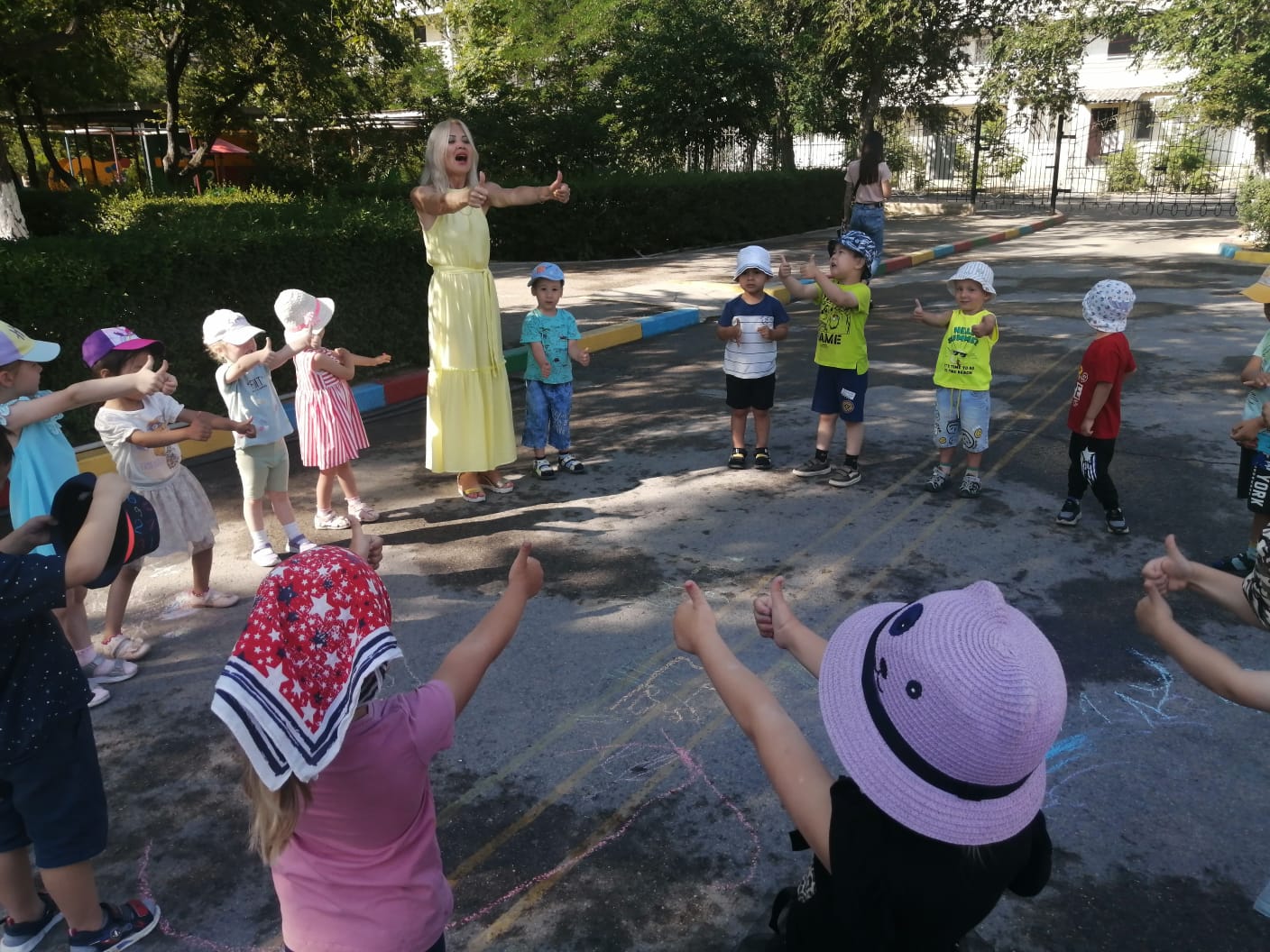№14 «Айгөлек»бөбекжайында жазғы оқу іс-шарасы. әр топ бүлдіршіндерімен әнімізде сыртта іс-қимылмен өтуде. Ән маманы; Онищенко .М.В тақырыбы: «Әніміз бар тамаша!»мақсаты: балалардың ән туралы түсініктерін қалыптастыру; әнді мұқият тыңдай отырып, сипатын ажырата алу, бірге ән салу, ән ырғағын дәл сақтап орындау дағдыларын жетілдіру; әнге деген қызығушылықтарын ояту; музыкалық есту, есте сақтау қабілеттерін дамыту.Әдіс - тәсілдер: салыстыру, сәйкестендіру, «ой қозғау», миға шабуыл, топтық жұмыс, дидактикалық ойын. «Көңілді шарлар». ән - песня, әнші - певец, ақын - поэт, сазгер – композитор