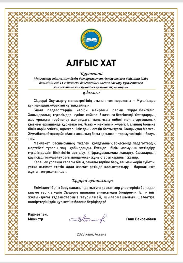 Быил педагогтердің кәсіби мейрамы ресми түрде бектіліп Халықаралық мұғалімдер күніне сәйкес 5 қазанға белгіленді. Осыған орай бөбекжай ұжымының жасұрпақтыты тәрбиелеу жолындағы тынымсыз еңбегі мен ағартушылық қызметі ұшын, Қазақстан республикасы білім және ғылым министрі Ғани Бейсанбаевтың алғыс хаты.