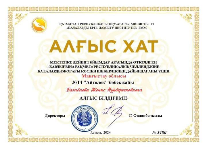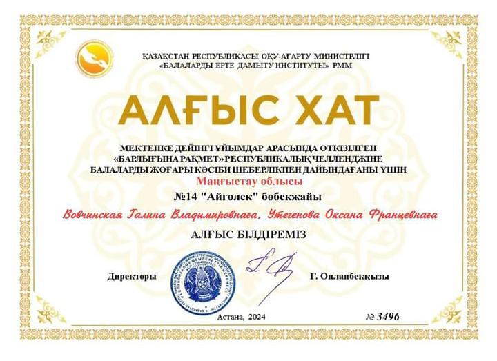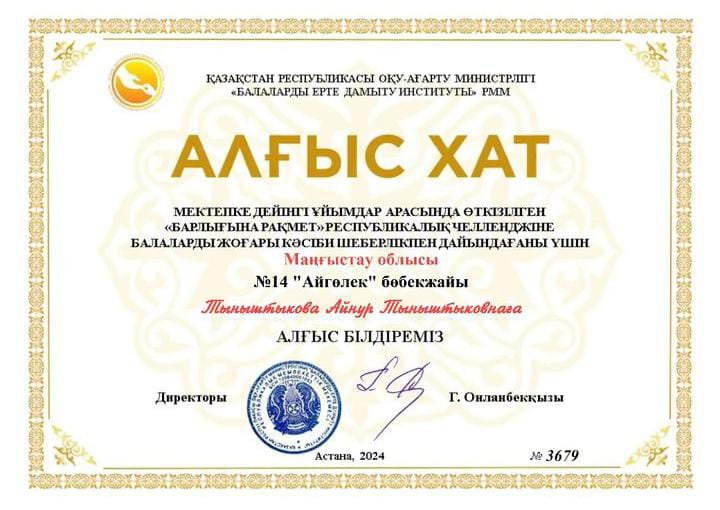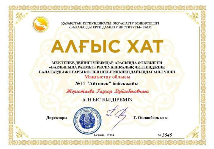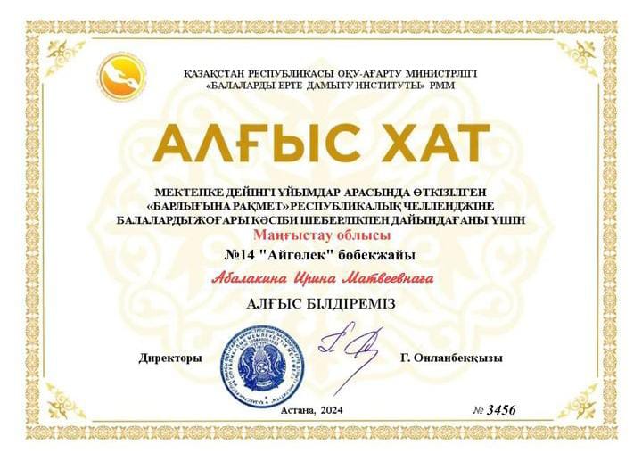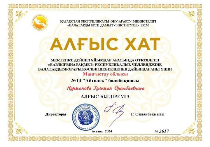 Мектепке дейінгі жастағы балалар және олардың ата -аналары Республикалық "Алғыс айту" челленджіне қатысты. Бөбекжаймыздың педагогтері белсене қатысып, өз үлестерін қосты. Мақсаты: өсіп келе жаткан жас ұрпақтарды адамгершілік, сыйластыққа, достық сезімдерін ояту. Өз еліне, отанға деген сүйіспеншіліктерін ояту. ҚР Оқу-ағарту министрлігі " Балаларды ерте дамыту институты " РММ атынан 7 педагог "Алғыс хат" қа ие болды. Ұжымга шығармашылық табыс тілейміз. Құттықтаймыз.