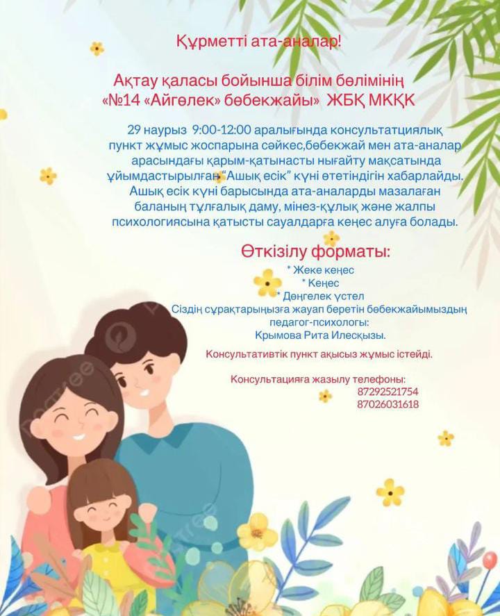 29 наурыз 9:00-12:00 аралығында консультациялық пункт жұмыс жоспарына сәйкес, бөбекжай мен ата-аналар арасындағы қарым-қатынасты нығайту мақсатында ұйымдастырылған "Ашық есік" күні өтетіндігін хабарлайды. Ашық есік күні барысында ата-аналарды мазалаған баланың тұлғалық даму, мінез-құлық және жалпы психологиясына қатысты сауалдарға кеңес алуғат болады.